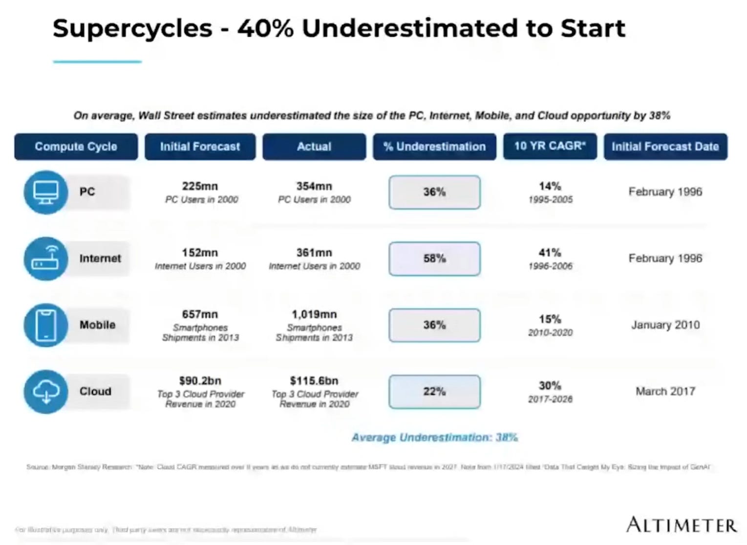 We often underestimate the size of super-cycles in hindsight. We knew the internet would be big, but the opportunity ended up being over twice as big as initially forecasted. AI will likely end up being a bigger opportunity than we originally anticipated.