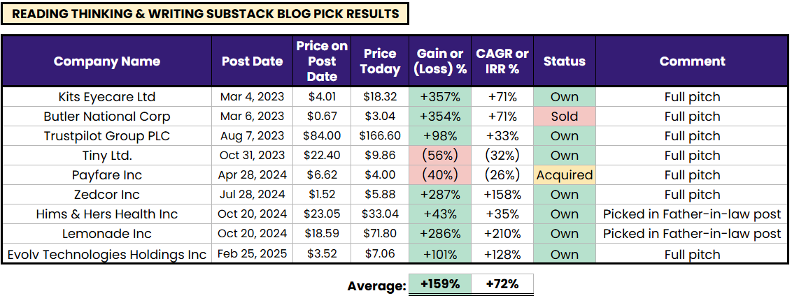Here is a summary table of returns since the companies were published on my blog (links to the actual posts are provided below):